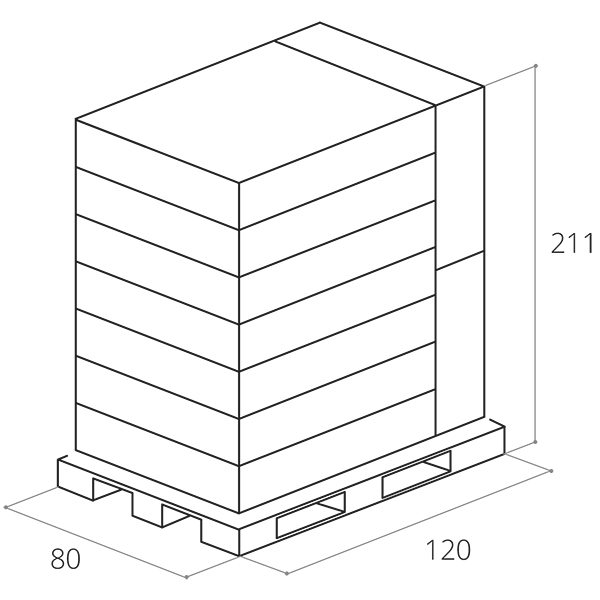 | Pallet size/cm L*W*H | Luminaires per row, units | Number of rows on the pallet | QTY per pallet/pcs | Kg per pallet | Volume per pallet, m3 | LDM, m | |